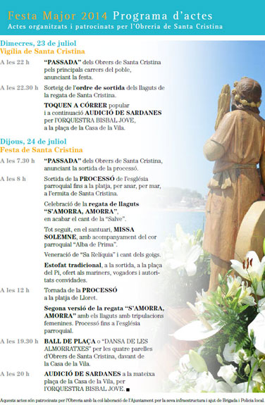 | A les 8 h | Sortida de la PROCESSÓ de l'església parroquial fins a la platja, per anar, per mar, a l'ermita de Santa Cristina. Celebració de la REGATA DE LLAGUTS, en acabar el cant de la "Salve". Tot seguit, en el santuari, MISSA SOLEMNE, amb acompanyament del cor parroquial "Alba de Prima". Veneració de "Sa Relíquia" i cant dels goigs. A la sortida, a la Plaça del Pi, tradicional estofat ofert als mariners i a les autoritats convidades.